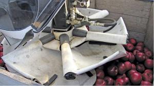 However, it's the decelerator at the bottom of the hose that is key to preventing bruising. The rotating foam rubber wheel catches fast moving apples and rolls them onto a distribution disk with canvas blades. From there they roll gently into the bin. The decelerator unit has an electric eye that gauges the level of apples in the bin and constantly adjusts its own height accordingly.