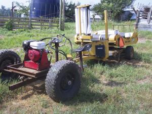 He first fitted the front end of the wrapper with the front axle from a 1981 4-WD truck. A 10-hp hydraulic power unit from a posthole auger provides power, and a salvaged hydraulic motor attaches to the front axle differential to drive the rig.