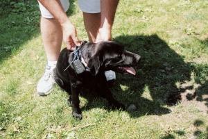 During the learning process, when our pup entered forbidden territory we would use a control box to signal the training collar to emit an electric shock. The shock causes the animal to get out of the territory he's in. It didn't take many of those shocks to educate him.