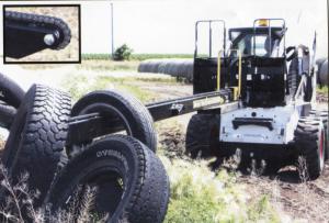No more tossing water-filled tires on silage piles with the Tire Gator 160. The 15-ft. beam with its self-loading bull nose makes picking up tires as easy as point and drive. Raised teeth on the #60 roller chain that runs the length of the bar pull the tires onto the bar and later feed them off as desired across the pile.