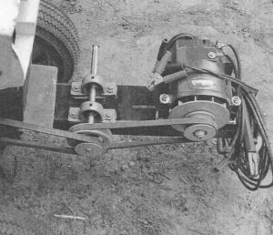 The used truck alternator is brushless with a stationary field coil that protrudes into the double V-belt driven field shell. This allows Toppen to put larger amounts of voltage into the field coil without overtaxing brushes. Otherwise, the alternator had the usual regulator, diode trio and bridge rectifier under the plate on the end cap.