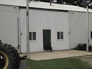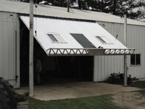 Replacing a worn out shop door with a flat panel raised by an electric hoist provided multiple benefits for Virgil Poock and his son Travis. With the flat panel lifted, they have a shaded work area outside the shop. In the closed position, they get easier access and better lighting because of the walk-through door and windows built into the big panel.