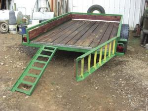 He built the trailer itself entirely from scratch. It's equipped with a cedar floor and sides, which he treated with a mixture of waste oil and thinner (1 gal. waste oil and 1 pint thinner). He bought a trailer house axle and cut out 30 in. to narrow it down. He cut old tires in half to use as fenders.
