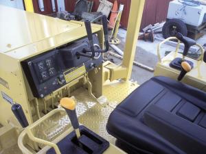 The cable from the old Cat power shift lever to the left of the seat hooked right up to the Deere transmission. However, Ammon had to fabricate a new H-pattern steel housing and linkage for the four ranges, which he mounted to the right of the seat. He used a shift lever from a Deere 7000 series tractor.
