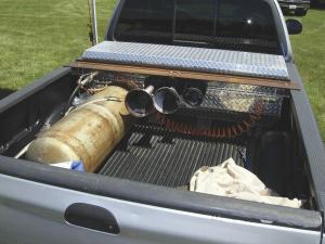 The new horns operate off a 100-lb. LP gas tank that sets on one side of the pickup bed. One set of three air horns bolt on back of a toolbox on front of the bed. Dam uses an air valve in the pickup cab to operate the horns. He can also use an antenna-based remote starting system to set the horns off.