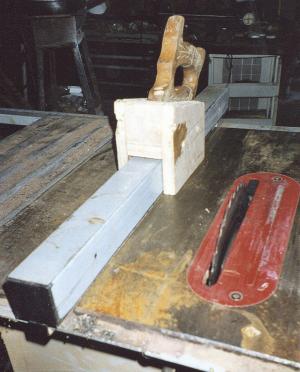 Homemade Wooden Block Fits Over Saw s Guide Bar FARM SHOP Miscellaneous Merl Stangl Atlantic Iowa: “When using my table saw instead of pushing the wood being cut with my hand I use a homemade wooden block that’s designed to fit over the saw’s guide bar The handle off an old crosscut saw is screwed and glued into the block which is made from 3/4-in thick plywood and painted white A side board extends down on each side of the block to the table saw’s surface ”