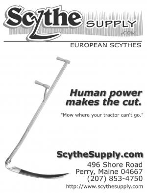 European-Style Scythes FARM HOME Miscellaneous Most Americans have abandoned scythes in favor of power mowing equipment even when it comes to cutting weeds around buildings and fences But if you’ve grown weary of the whine of string trimmers maybe you’re ready to try a scythe If you’ve used a scythe in the past and disliked the experience you were probably using the wrong kind of scythe The European-style scythe works so well you may want to park your lawn mower and use one to cut the lawn The bush style of scythe may be used to trim undergrowth in your woodlot and the ditch style may be used for brambles and tough weeds Most scythes sold in America are heavy and poorly balanced Not only that but the angle at which the blade mounts on the handle called a snath tends to require that the worker bend over to cut with it On the other hand his European-style scythes are lightweight and well balanced The blade and handle are positioned to allow a comfortable upright stance Contact: FARM SHOW Followup Scythe Supply 496 Shore Rd Perry Maine 04667 ph 207 853-4750; email: scythe@scythesupply com
