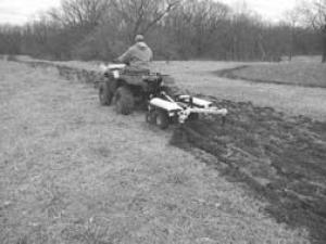 The Till-Ease is a 43-in. wide chisel plow/field cultivator designed to be pulled behind any 4-WD ATV or other small towing vehicle. It has a row of 13 1/2-in. dia. coulters on front and five rigid shanks on back arranged in a V-shaped pattern. The shanks slip into a receiver tube and can be quickly removed by simply removing a pin. The shanks can be equipped with either chisel points or 9-in. wide sweeps. An optional drag harrow for final seedbed preparation pins into receivers on back of the tool’s frame.