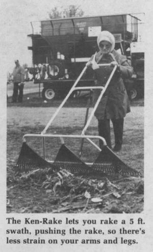 "The main advantage of the Ken-Rake is that you don't get tired of raking leaves," says the inventor. "You're doing all the work with your legs, instead of your arms, which allows you to rake three times faster than with a conventional broom rake."