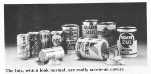 RC Cola, Diet Rite soda, Miller beer, Penzoil, Valvoline and Quaker State cans are available.