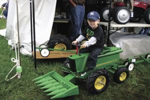 A toy combine at the recent Ohio Farm Science & Review Show drew a lot of interest. Little kids were hopping onto a toy Deere 9870 combine powered by a gas engine and complete with a 6-row corn head and an unloading auger. Jeff Moore of Moore’s Farm Toys in Dresden, Ohio, made the unit by converting a commercial pedal combine sold by Scale Models of Dyersville, Iowa.