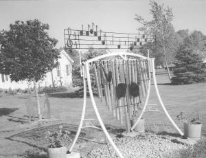 The pipes hang from a cable at the top of the glider frame and gradually get longer toward the middle. Four metal pendulums, shaped like musical instruments, strike the pipes. Sixteen metal notes mount on a large music staff at the top of the frame and represent the hymn “What a friend we have in Jesus”.