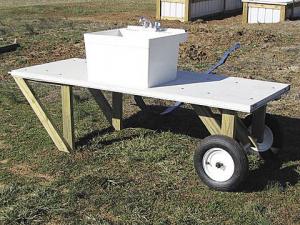 I bought an old kitchen sink at a second hand store for a few dollars. I used 2 by 4’s to build a 6-ft. long, 4-ft. wide wood frame in the shape of a long wheelbarrow and bolted an old steel door onto it, then bolted the sink on top of the door. The wheelbarrow rides on a pair of 8-in. wheels and has pipe handles that measure about 1 ft. long. I attached a female coupler to the bottom of the faucet so I can hook a garden hose up to it.