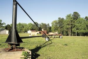 He used 2, 3 and 4-in. steel tubing for the frame and mounted two tires on homemade swivels on the front end. In training mode, the cart is tethered by a 60-ft. long, 4-in. steel tube pole anchored at a center point. The center point is a truck axle buried in concrete with the wheel hub sticking out.
