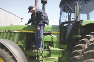 Steps For Deere 4850 MFWD Tractor TRACTORS Accessories I came up with a couple of different steps for my Deere 4850 MFWD tractor One is used for fueling the tractor and the other for cleaning the cab windows To fasten the step for the cab I drill holes in the tractor and use 4 self-tapping screws The step for the fuel tank uses existing holes in the tractor frame I also came up with what I call “dirt skirts” that help keep dirt off my Deere 4850 MFWD tractor’s radiator screens which are located on the sides of the tractor As the front wheels churn they bring up dirt and chaff and corn leaves that get sucked in against the radiator The dirt skirts mount inside the fender to stop such trash from being sucked against the radiator grill I simply cut up some rubber floor matting to follow the curve of the fender and then bolted the mat to the fender It doesn’t stop the trash completely but it definitely helps Harold Fratzke 234 Shoreview Drive Cottonwood Minn 56229 ph 507 423-6341; cell 507 530-6090