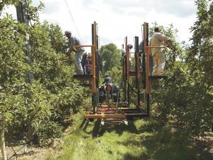 Less than 60 in. wide to fit between tree rows, the platforms raise up to 8 ft. and out an additional 5 ft. to allow workers to do a variety of work on trees.