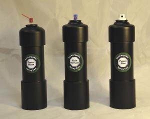 Smidt’s rechargeable can is constructed using pvc pipe, a valve stem air valve, a brass plug, and a few simple tools. The spray buttons, valve and stems are taken from existing spray cans.