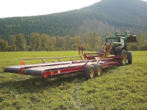 Belted Bale Wagon Easy On Wrapped Bales BALE HANDLING “The first year we made round bales my wife and I picked them up with a loader and a gooseneck trailer It took us 4 hrs to haul about 110 bales and I knew there had to be a better way ” says Jack Rennie a cattle producer and metal fabrication shop owner in B C Canada “I sketched out the idea for a bale wagon that night and we built it in our shop After 3 years of testing re-working and finally getting our patents we’ve got a machine that really works well ” Rennie’s automatic bale wagon loads hauls unloads and stacks plastic or twine-wrapped round bales in half the time it takes handling them individually “I can pick up 12 wrapped bales in less than 10 min and have them unloaded and stacked in 5 min ” Rennie says Rennie’s machine can handle plastic-wrapped round bales without puncturing the bag His machine design includes arms that cradle and squeeze the bale then lift them up and place them on a platform with a movable belt The bales are never touched by sharp metal edges or a moving chain Rennie’s Round Bale Wagon carries 10 5-ft wide bales or 12 4-ft wide bales at a time The machine has a sturdy high carbon frame to support heavy balage Excellent flotation is provided by four 31-in by 13 5-15 high-flotation tires mounted on walking beam axles The overall machine width is 10 ft 6 in and length including the tongue is 32 ft Bales are lifted and loaded onto the wagon as it’s pulled through the field by a tractor The bale cradle can be adjusted hydraulically from 38 in to 62 in and the length can be manually adjusted from 48 in to 60 in “One person can easily load bales on the wagon haul the load to a storage site and unload them in a closely packed stack without leaving the tractor seat ” Rennie says “This automatic loading and unloading lets a farmer handle bales twice as fast as he would with a conventional loader placing them on a trailer one by one It’s a convenient efficient and cost effective way to move a lot of plastic-wrapped bales quickly ” Rennie said he worked with his machine three years before settling on his patented design The Round Bale Wagon is priced at $50 000 Canadian and available from Rennie Equipment The company hopes to establish a dealer network in the coming months Contact: FARM SHOW Followup Jack Rennie Rennie Equipment Inc 1431 Dyffryn Rd P O Box 788 Lumby B C Canada V0E 2G0 ph 250 547-6399; www renniequipment com