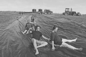 The 14-year-old tested the idea last August by stretching out two recycled bags to create a slide about 300 ft. long and 30 ft. wide. He placed it on the slope of a hayfield and secured it with harrow pins on the top and sides. He loaded a couple of 400-gal. tanks on a trailer and filled them with water.
