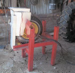 “I rotate the wheel at 16 rpm’s. By loosening a double-nutted bolt I can vary the gap between the tire and channel iron, according to the size of the walnuts.”
