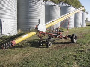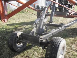 Auger Mover Made Out Of Riding Mower AUGERS Brent Litke didn’t want to spend the money for a new hydraulic-driven mover kit for his grain auger So the Leduc County Alta farmer made his own auger mover out of an old riding mower “I use it on my 30-ft long 8-in dia auger I stand next to the auger and use toggle switches inside a control box to control all operations I spent only about $1 500 compared to $5 500 for a comparable commercial model ” says Litke His 30-ft auger is equipped with a Kohler 16 hp engine He stripped a 20-year-old Murray riding mower with a 5-speed transmission down to the front wheels and axle then used 2-in steel tubing to build an A-frame that attaches to the auger frame He mounted the mower’s transmission between the auger’s wheels A belt-driven shaft runs through the transmission to drive both wheels with the mower’s original 12-volt clutch used to start and stop the belt A control box equipped with 4 toggle switches mounts on one side of the auger frame and is used to control 4 electric actuators that run off the auger’s battery One actuator is used to engage the transmission one to shift gears one to steer the mower axle and one to raise the back end of the auger tube off the ground Both the auger’s wheels are fitted with large ring gears driven by a small gear mounted at the end of the shaft To pull the auger down the road behind a pickup Litke disengages the small gear and moves it in on the shaft a few inches then secures the gear with a cotter pin Contact: FARM SHOW Followup Brent Litke 49553 Range Road 261 Leduc County Alta Canada T9G 0J4 ph 780 986-6263; litkefarms@hotmail com