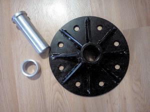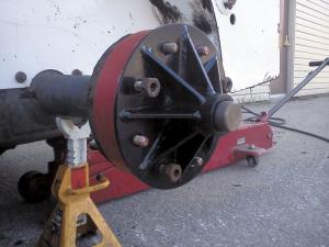 What Titera came up with was a puller plate drilled to match the bolt pattern on the hub. It has a big pin at the center. Once the wheel is removed, he slips the plate with the pin in it onto the bolts and tightens the lug nuts. The pressure of the pin against the axle pops the hub loose.