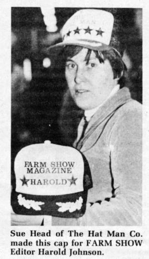 You can pick out a background logo or emblem from a variety of selections = cattle, hogs, horses, etc. - and have your farm name imprinted on it. Space limits lettering to 4 lines. Up to 22 letters are included in the base price of $8.50. Add 15ó per letter over 22. (The limit is 44 letters.) Logos imprinted are $1.00 extra. Hats are available in a wide variety of colors, including gold, red, blue, black and white. For more details, contact: In the U.S. - FARM SHOW Followup, The Hat Man, Box 823, Niagara Falls, N.Y. 14302.