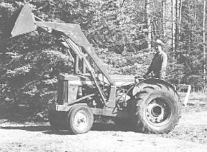 I used an old Deere 46A loader. The loader arms had to be narrowed up to fit the tractor. I made gussets for the tractor's frame and mounting plates for its axles.