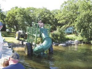 He welded the 22 1/2-ft. “tractor” frame together and bolted the slide to the deck at about 11 ft. off the ground. He bolted the bottom of the frame to salvaged tractor axles. There’s even room for a tractor seat swing under the “tractor” deck. A hitch on the front allows Seifert to back the big rig down into the water using a real Deere tractor. A sump pump in the lake brings water up to the top of the slide to make it slippery and fast.
