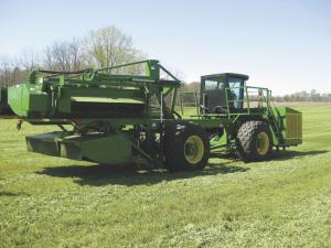 “We convinced him to try a self-propelled unit,” says Vogel. “We built a frame and used a 9L Deere diesel for the power unit. We reused Maust’s three Deere 994 rotary mower conditioner heads that were still nearly new.”