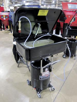 The parts washer is equipped with a 34 by 20-in. wash tank with a hinged metal lid that’s kept open by a spring. The wash tank mounts above a 5-gal. pressure tank mounted on 4 caster wheels. A 10-gal. solvent tank mounts above the wash tank, which contains a metal screen used to separate dirt and grease from the part.