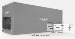 Air-Vac air cleaners are housed in a simple 16 gauge steel powder coated cabinets that measure 2 ft. square by 5 ft. long. An electric fan located at one end of the cabinet pulls the dirty air through two filter stages and exhausts the clean air back into the shop.