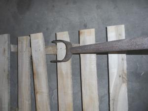 “It consists of a 3-ft. long, 1 1/4-in. dia. heavywall pipe welded at an angle to a U-shaped ‘prybar’ - a length of 1/2-in. thick by 1 1/2-in. wide flat steel bent into a U shape. The operator places the prybar under the slat on both sides of the rail the slat is nailed to, and then presses down on the pipe and against the rail to work the nails up and out. Works great.”