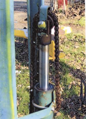 He used 1/2-in. thick by 3-in. wide flat stock to make the forks, which are attached to a carriage and raised up or down by a hydraulic cylinder. The carriage rolls on masts that he made from 2 1/2-in. mechanical tubing and is connected by motorcycle chain to the cylinder. The masts are welded to the snowplow mounting bracket, which consists of a 1/4-in. thick steel plate that slides onto the tractor.