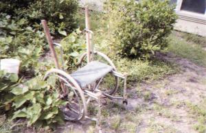 Modified Wheelchair Works Great In Garden FARM HOME Miscellaneous I知 a retired 91-year-old gardener and use an old modified wheelchair to make life easier I removed the backrest fabric from the chair and simply sit over the big wheels I move along by turning the wheels by hand The chair will straddle one row of beans or peas so I can pick three rows at a time I added a pair of wood handles on back which makes it easy to move the chair from place to place I make sure not to till the ground close to picking time so the ground remains as smooth as possible I知 6 ft 4 in tall so I really appreciate how this wheelchair saves my back Homer Robertson 549 Dean Church Rd Ozark Ala 36360