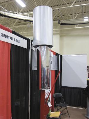 His diffuser knocks down the wind velocity at the top of the chimney by introducing outside air at the top of the flue. “When the diffuser is raised, up to 75 percent of the air caught in the wind’s siphoning effect is outside air. That means far less heat is pulled out the chimney. Down-drafts from strong gusts are also reduced,” says Maas.
