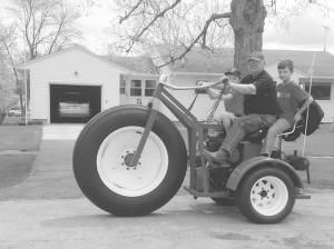 The big front wheel with an 11.75 by 28-in. tire was bought at a farm sale. The hydrostatic transmission and rear wheels came off an old Toro golf course mower. The frame was built from sq. tubing, as were the front forks and the front wheel steering spindle. The seat is off a Harley Davidson motorcycle, and the Sissy Bar is off an old motorcycle that his kids had years ago.