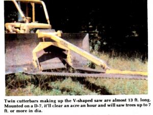 His giant-size saw is the result of his search of a way to grub out big trees with small equipment. By equipping his smaller dozer with the special saw, he can easily bring down trees up to 71/2 ft. or more in dia.