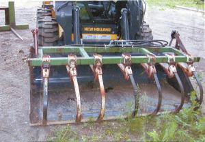Cultivator Shanks Used To Build Grapple Fork CULTIVATORS A North Dakota farmer came up with his own inexpensive heavy-duty grapple fork that mounts on the bucket of his New Holland skid loader Harlen Grovom who farms near Park River used part of the frame and some shanks from an old IH Vibra Shank field cultivator to build the grapple fork He bolted it to the 6-ft wide bucket on his New Holland 225 skid loader “I saved a lot of money and it’s a great grapple Cultivator shanks are always built strong so they’ll stand up to a lot of tough use ” says Grovom The grapple fork has seven 2-ft long curved shanks spaced about 6 in apart Each shank measures 1 in thick by 2 in wide He cut off part of the cultivator frame and bolted it onto the back of the bucket A pair of hydraulic cylinders are used to raise and lower the entire unit The frame swivels up and down on 1-in thick bolts that go through a pair of steel bars welded to the frame “I use it to handle everything from rocks to 2-ft long blocks of wood that I use in my wood stove I’m amazed at how well it works ” says Grovom “Last fall I picked up 10 loads of rocks with it and never had to get off the skid loader at all The shanks open up about 7 ft high and are spring-loaded so I can pick up really big loads ” Contact: FARM SHOW Followup Harlen Grovom 12643 Hwy 17 Park River N Dak 58270 ph 701 331-0169