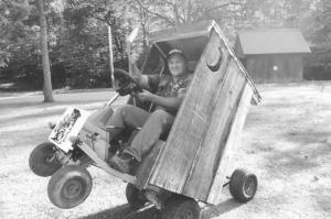 “It’s a big hit everywhere I go,” says Craig Czako, Mt. Morris, Penn., about the wheelie-popping “johnmower” he built by attaching a wooden outhouse to the back of a Sears riding mower. A 2-wheeled wheelie bar trails behind to make sure the rig doesn’t tip over backward.