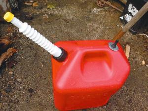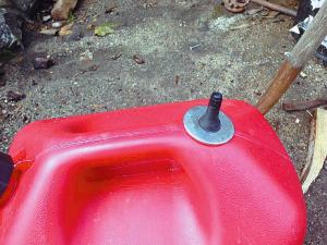 “The hole I drilled is small enough that the larger bottom section of the stem’s valve could be pulled through,” says Gill. “I put a washer on top of the can and then pulled the valve through the washer. Even when the can is tipped over, fuel won’t leak out. With the core valve removed, it’s easy to fill a tank because the air rushes in through the valve once the cap has been removed.”