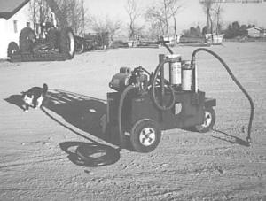 He stripped the 3-wheeled pressure washer down to the 110-volt electric motor and pump. He mounted two spin-on fuel filters (designed for Cummins diesel engines) onto lengths of angle iron welded to one side of the cart. The filters plumb into the pressure side of the pump. To use the rig he starts the pump and puts one end of a rubber hose from the suction side of the pump into the oil drain pan. The pump draws oil out of the pan and pumps it through a rubber hose into the first fuel filter. From there it goes through a short length of hose to the second filter and then out a hose to a storage tank.