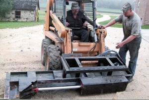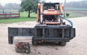 Mounted on the skid loader, the splitter can be raised, turned and used as a thumb to pick up wood to split or load on a trailer. The splitter easily splits hardwood up to 30 in. long. The Feuchts use the machine to split wood 12-in. dia. and larger.