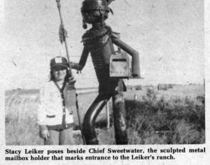 While cowboys have been the favorites of customers over the years, an Indian mailbox marks the entrance to Leiker's "Sweetwater Ranch" near Victoria, Kan. He has also created a greyhound for one woman, a hog mailbox for a hog farmer and a quarterback for a former Kansas State University football coach.