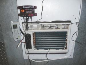 Wittman ended up with a slightly smaller than planned 7 by 8-ft cooler that he mounted to a freshly poured concrete slab Cooling is provided by a used air conditioner and a CoolBot control system Vol 32 No 5 that Wittman purchased on eBay The CoolBot micro-controller constantly monitors the walk-in cooler and adjusts the A/C fan and compressors as needed to keep the cooler at the desired temperature without freezing up