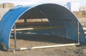 Grain Bin Converted To Handy Calf Shelter GRAIN HANDLING Pneumatic Systems Mel Durr Hilda Alberta decided an old 1 500-bu steel grain bin would make a neat calf shelter It’s 14 ft wide and 17 ft deep with a 7-ft high opening “It makes a solid shelter that will keep our bedding and cattle dry for many years ” he says He used zip cut blades to cut around the top and bottom of the bin then removed the roof and floor and cut the remaining bin in half to make 2 identical half circles He used 4-in dia pipe to build frames and set the 2 half circles over them Metal brackets welded onto the frame bolt to the bin walls He also closed in the back side of the structure with wood planks “I didn’t close the back side in to solid because I wanted plenty of air movement so the cattle won’t overheat ” says Durr noting that the pipe frame also serves as a skid to move the unit wherever it’s needed Contact: FARM SHOW Followup Mel Durr P O Box 99 Hilda Alberta Canada T0J 1R0 ph 403 838-2263