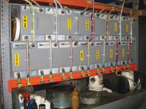 So he set up a big gravity-fed, bulk oil dispensing pallet rack system. Several 55-gal. drums set on the top 3 racks, each with a different type of oil, while 14 rectangular 30-gal. clear plastic tanks set on the lower 2 racks in a staggered fashion. Oil gravity flows from the drums into the tanks, and from there through hoses fitted with ball valves. A big 250-gal. overflow containment tank on the floor under the tanks catches any spillage and has a metal screen on top of it to place buckets and drain pans.
