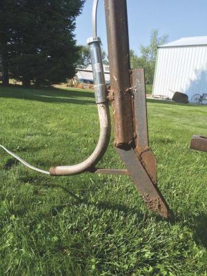 “Made It Myself” 3-Pt Trencher Lays In Cable MISCELLANEOUS EQUIPMENT Earth Movers “I needed to bury an electric cable to my daughter’s playhouse without destroying my lawn There was nothing on the market that would do what I needed at a reasonable cost so I built one ” says Michael Boyer Post Falls Idaho He built the trencher by welding a short length of 1-in thick scrap steel at an angle to a vertical length of square steel tubing The top end of the tubing is welded to a horizontal tube that fits into a receiver hitch which mounts on a steel bracket that fastens to his tractor’s 3-pt hitch A 1/4-in thick “cutting edge” is welded on front of the trencher A curved 1-in dia tube clamps on behind and feeds the cable down into the bottom of the trench “It works similar to the trenchers used by utility companies to lay in cable except instead of pulling it behind a bulldozer I’m using my Deere 2250 2-WD loader tractor ” says Boyer “I’m able to lay cable about 20 in deep “I keep the cable spool on a vertical pipe that attaches to the loader bucket and keep the bucket up in the air The cable comes off the spool back over the tractor and down to the trencher Once the trencher knife enters the soil the forward motion of the tractor sucks it down into the soil It’s a small trencher but it takes everything my 50 hp tractor has to pull it “The only limitation is that I have to make big slow sweeping turns A tractor equipped with front wheel assist would probably work better because the front end would be pulling allowing a tighter turn Contact: FARM SHOW Followup Michael Boyer 10547 N Idaho Rd Post Falls Idaho 83854 ph 208 777-0861; boyermike@msn com