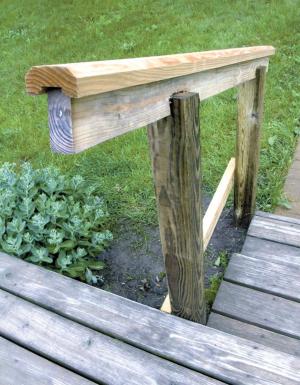 Here’s a simple handrail for a 2 by 4 stairway railing. It fits over another 2 by 4 set on edge. Just cut a dado that’s sized to fit over the side of the 2 by 4 and then bevel the top edges. Gives a finished look to the railing and a better grip. (Dillon Phillips, Indianola, Iowa)..........