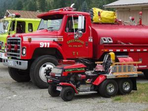I built a mini firetruck for a local parade. It started life as a Craftsman 16 hp. mower. I replaced the blown Briggs & Stratton motor with a 621cc Kohler, and then added some hot rod parts – a blower hood scoop that works off the throttle, Harley Davidson short mufflers, and a deadman switch on a tether cord. I mounted an old fire department siren on it and “wig wag” LED lights. Friends made the hose beds and ladders. It sounds awesome and goes very fast because I used pulley ratios that give me up to 40 mph. I made a tandem axle that’s supported by independent suspension. That way the drive wheels are always in contact with the ground. The 10 by 20 8-in. wheels were finished off with chrome mags. It’s loud, fast and red! (Ed Brouwer, Osoyoos, British Columbia)